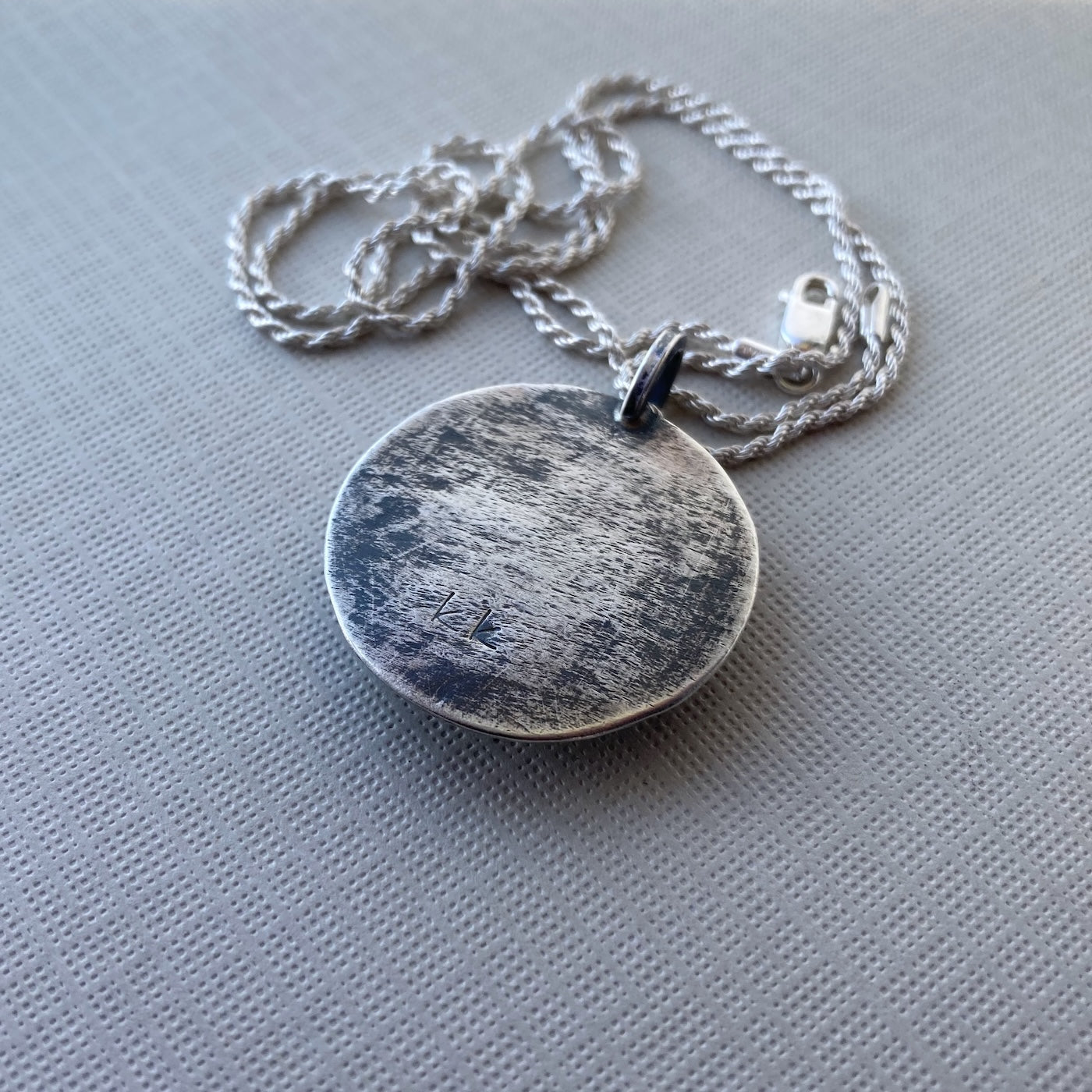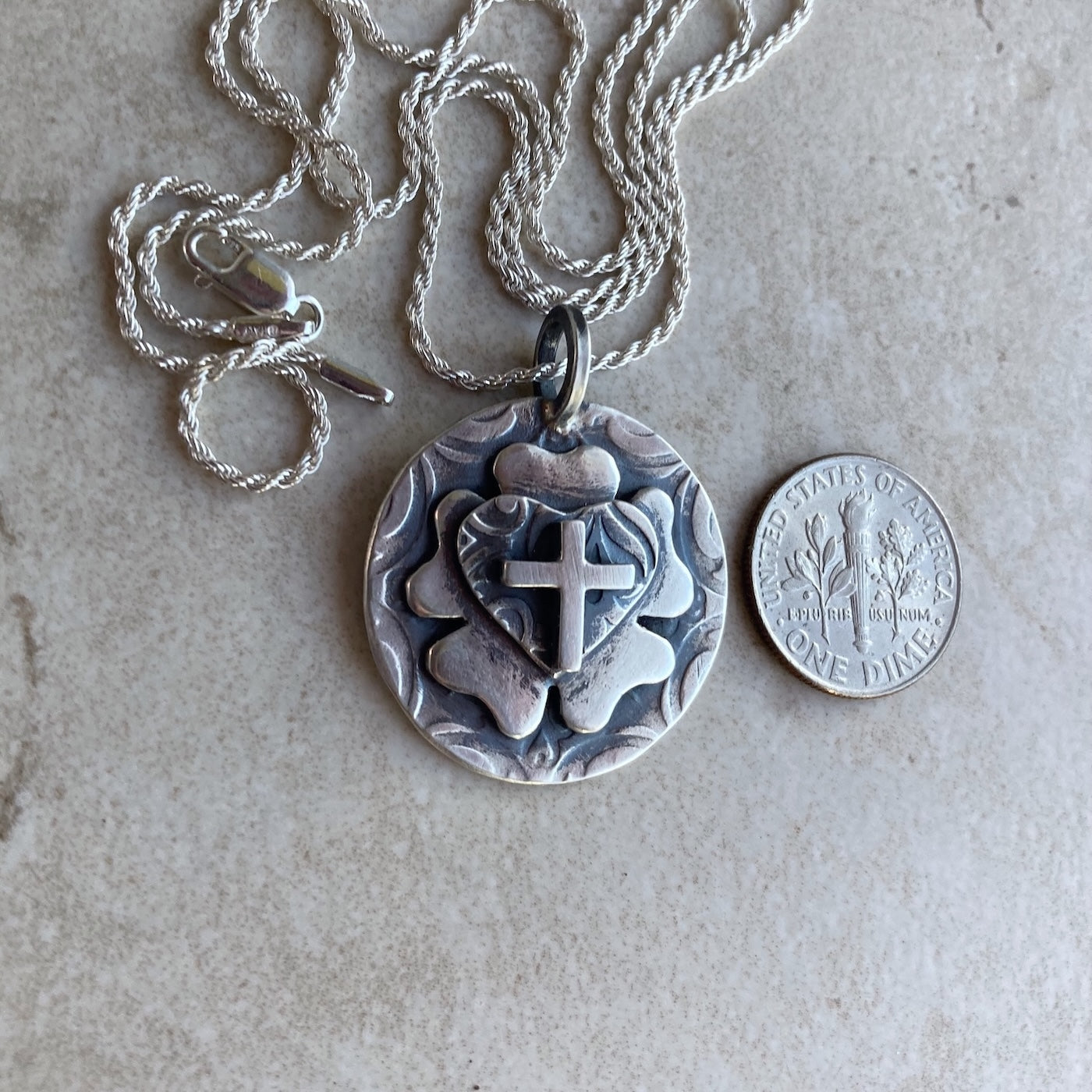 This necklace is oxidized, stamped sterling silver. The Luther rose pendant is one inch in diameter. The sterling French rope chain is 18 inches long; the weight of the piece...