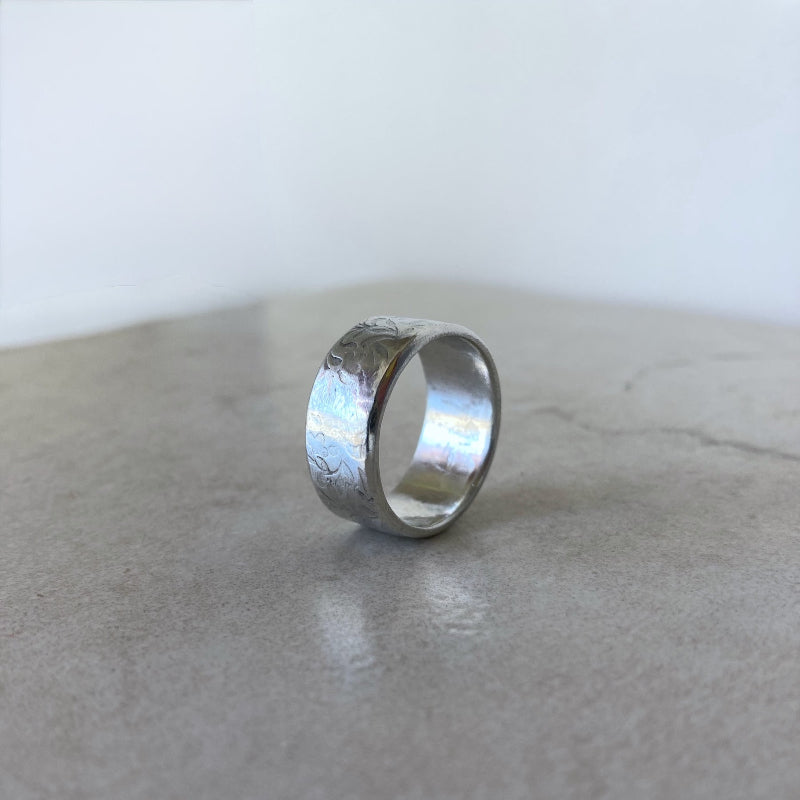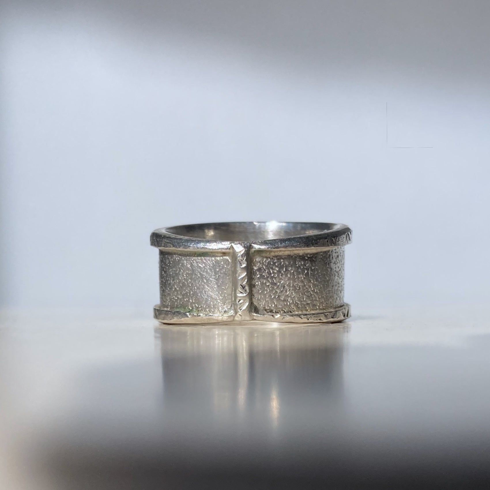 This bordered and textured sterling silver ring has a solid 14K gold cross and studs on both sides. The inner diameter is 18.5 mm (size 8.5). The weight of the...
