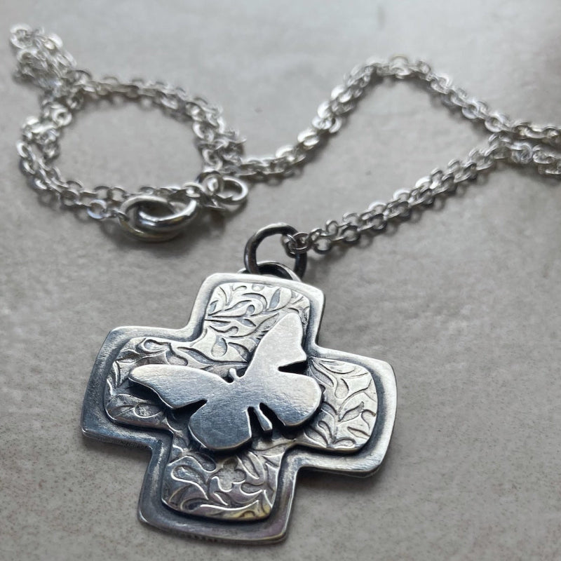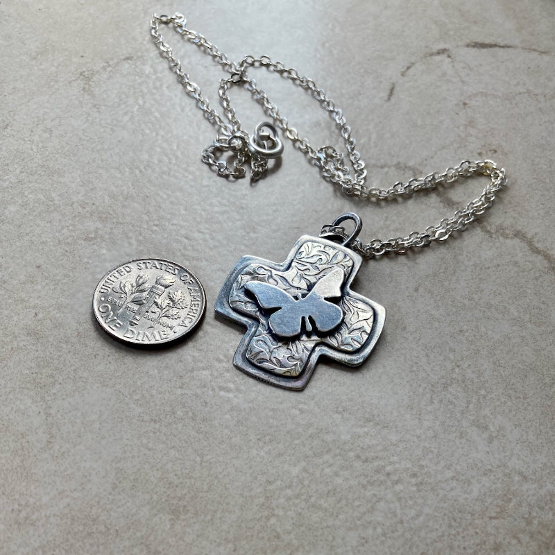 This cross pendant is oxidized, mill-patterned sterling silver with a cutout butterfly on top. (The butterfly is a Christian symbol for the resurrection.) The pendant is 1 x 1.25 inches....