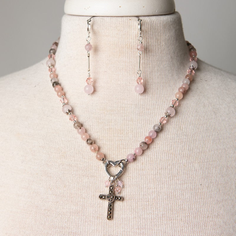 Jennifer's Rose Quartz Cross Necklace and Earring Set