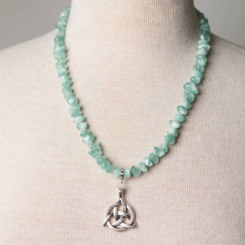 Polished green moonstone chips strung with a silver Trinity knot pendant. The pendant is attached with a hinged bail, allowing the owner to remove it. Necklace length about 18" plus...
